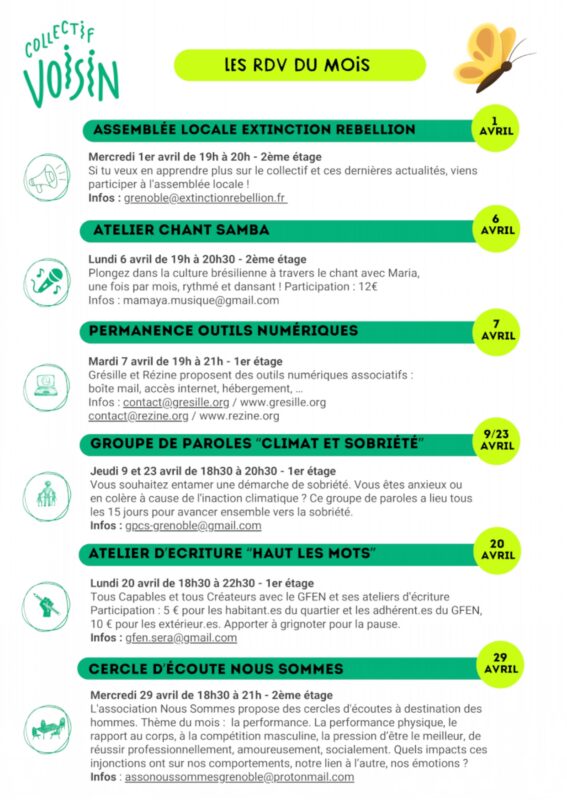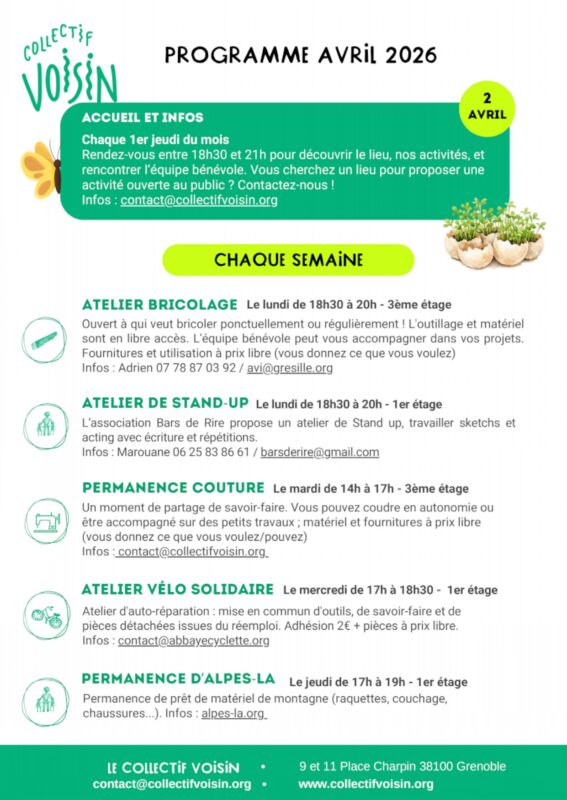Le Collectif Voisin reste, encore et toujours, ouvert aux nouvelles initiatives, activités et nouveaux bénévoles du quartier avec la possibilité d’occuper et d’y proposer ses activités, ateliers, et évènements ! Vos propositions et projets y sont les bienvenus ! Toutes et tous ensemble, continuons de faire vivre le Collectif Voisin, ensemble continuons à faire vibrer ce Quartier de l’Abbaye de Grenoble !